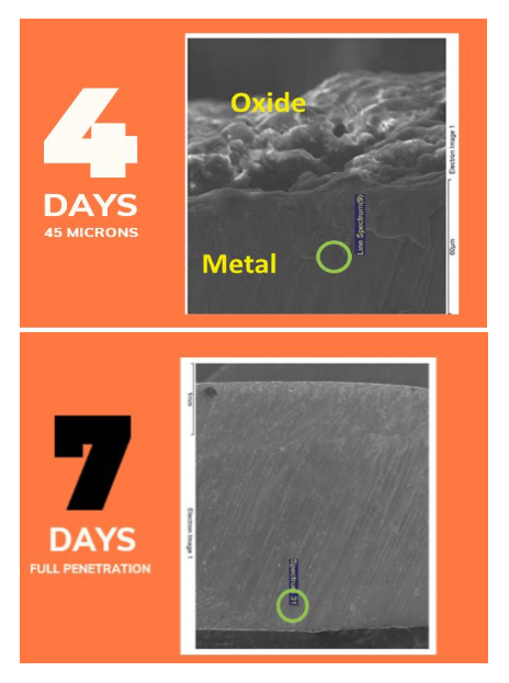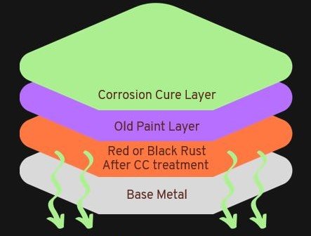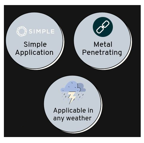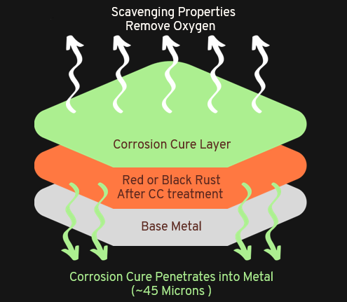 The material penetrates into the metal at a rate of 500 microns per month and as a result the metal becomes immune from rust. It has anti corrosive properties and acts as an oxygen scavenger that penetrates metal substrates, replacing oxygen molecules thus prevents corrosion from recurring.